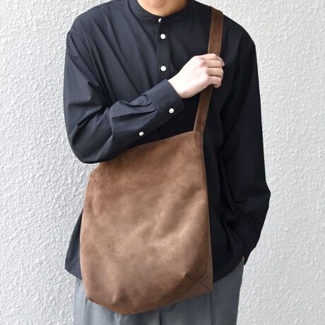 表面をスエード(牛革)、裏面を強度と耐久性に優れたポリエステル素材に切り替えたショルダーバッグ。