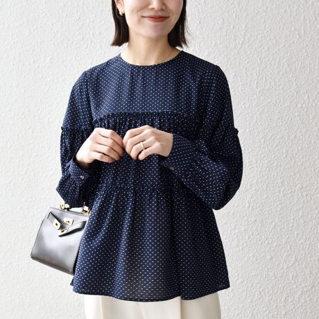 細かなドットプリントとギャザースリーブがほどよい甘さをプラスし、大人のカジュアルスタイルにも取り入れやすい一着です。