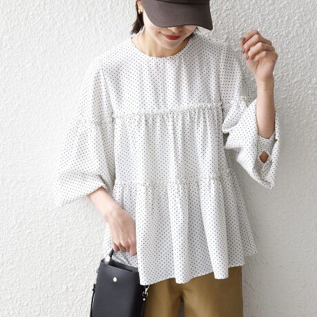 細かなドットプリントとギャザースリーブがほどよい甘さをプラスし、大人のカジュアルスタイルにも取り入れやすい一着です。