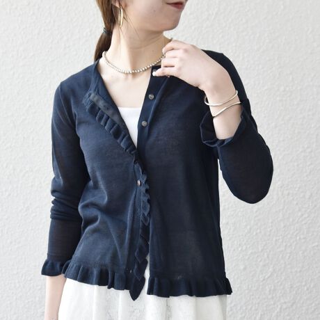 フリルディテールが上品な甘さを引き立てる、クルーネックカーディガン。
