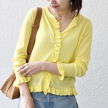 フリルディテールが上品な甘さを引き立てる、クルーネックカーディガン。