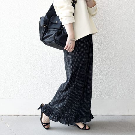 ドットプリントと裾のフリルが目を惹くイージーパンツ。