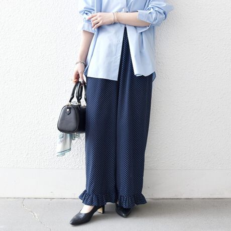 ドットプリントと裾のフリルが目を惹くイージーパンツ。