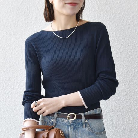 程よくフィットするサイジングと、華奢見えするボートネックでレディライクな印象に。