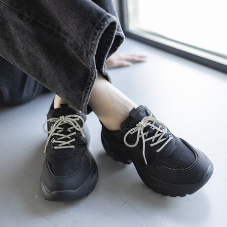 スポーティーなデザインと華やかなストーン付きリボンの組み合わせがポイントの厚底スニーカー。