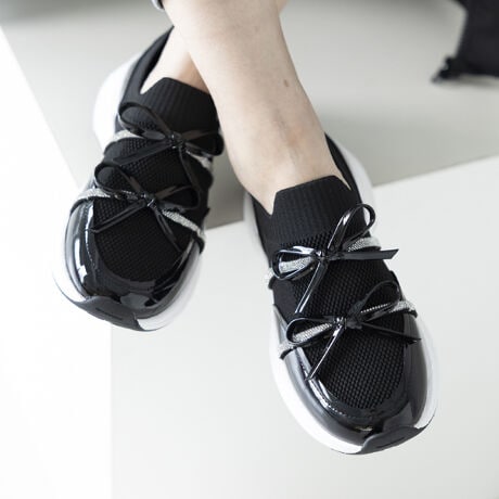 エナメル×ニットの素材ミックスが印象的なスニーカー。