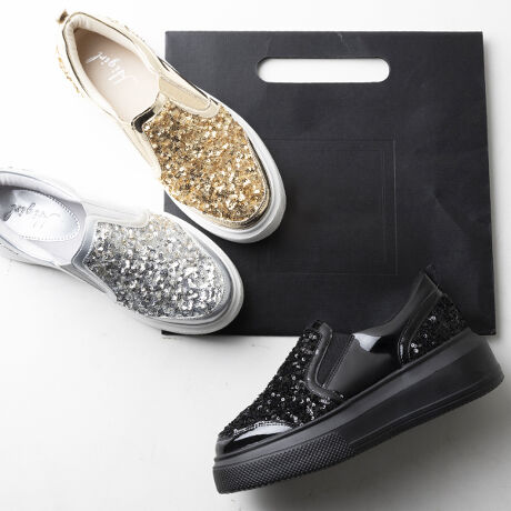キラキラのスパンコールで存在感のある厚底スニーカー。