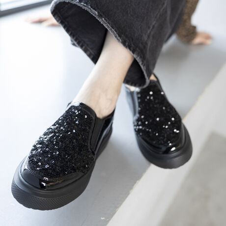 キラキラのスパンコールで存在感のある厚底スニーカー。