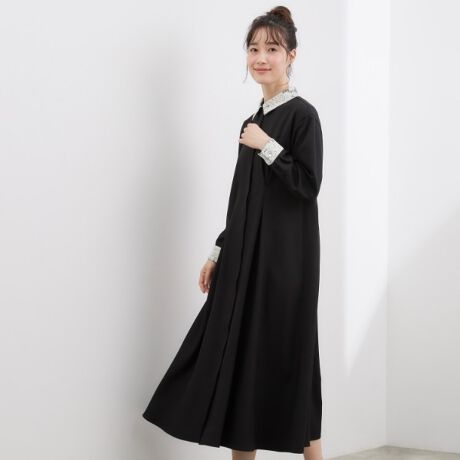 レースを二重にした襟が印象的な、上品な佇まいのシャツワンピースです。