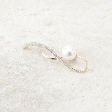 しなやかな曲線とフェイクパールの存在感が、装いに上品な華やぎを添えるブローチ。