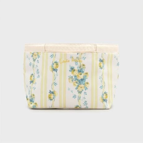 薔薇や牡丹が蔓や葉と絡み合うこの上品なプリントは、クラシックなストライプに時代を超えた魅力を添えています。