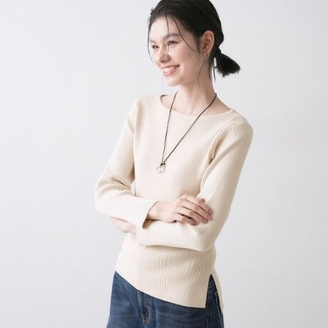 ボートネックと袖口のスリットがすっきり見えします。