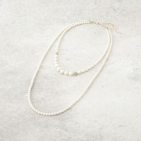 2連デザインで首元にほどよい華やかさを演出し、留め具を外すことで、シンプルな1連ネックレスとしても使用可能。