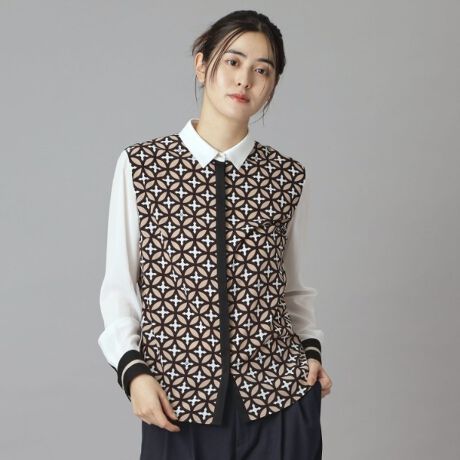 前立て部分や袖の配色デザインのアクセントを効かせ、着心地にこだわったブラウスです。