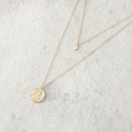 大きさが異なるコインモチーフのネックレスは2連使いできるタイプ。