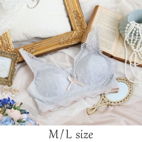 優雅なアンティークの世界から生み出された、愛の言葉が散りばめられたシリーズです。おやすみブラはカップ全体を上品なレースで覆い、長く愛せるデザインに。ワンポイントで2種類の素材を重ねた大ぶりなお花のアップリケをあしらうことで、まるで優雅な貴婦人の髪飾りのような華やかさを表現しています。