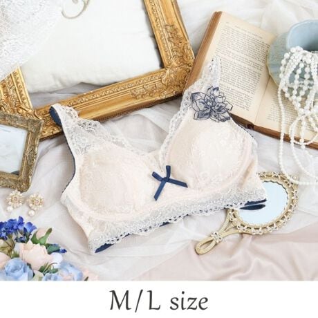 優雅なアンティークの世界から生み出された、愛の言葉が散りばめられたシリーズです。おやすみブラはカップ全体を上品なレースで覆い、長く愛せるデザインに。ワンポイントで2種類の素材を重ねた大ぶりなお花のアップリケをあしらうことで、まるで優雅な貴婦人の髪飾りのような華やかさを表現しています。