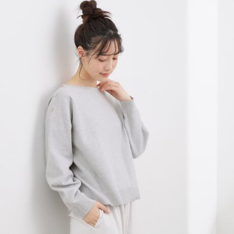 ボートネックのすっきりとした開きが顔まわりをきれいに見せ、身頃はすとんと落ちるシルエットで体のラインを拾いにくいのもポイント。