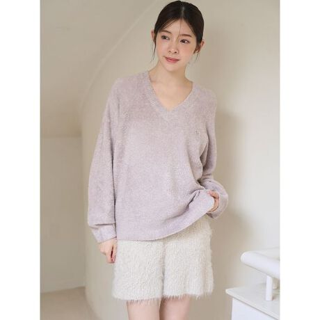 なめらかな肌触りのVネックニットと、毛足の長いシャギーニットのショートパンツを組み合わせた異素材セットアップです。