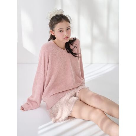 ややオーバーなシルエットの浅めVネックニットに、シャギーなボトムの素材感が可愛く個性を添えてくれるコーディネート。