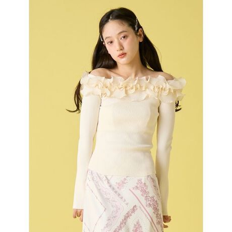 ボリュームたっぷりの立体フリルが視線を奪うリブニットトップス。布帛にプリーツを施してお花のように仕立てたフリルは、どの角度から見ても華やかで存在感のあるデザインです。肩まわりはほどよくデコルテが見えるバランスに設計し、そのままはもちろんオフショルとしても着用可能。ニット部分はテンションのあるリブ編みで身体に沿い、美しいシルエットをキープします。きれいめスカートとのエレガントな組み合わせはもちろん、パンツとのフェミニンカジュアルなスタイリングもおすすめです。