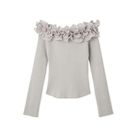 ボリュームたっぷりの立体フリルが視線を奪うリブニットトップス。布帛にプリーツを施してお花のように仕立てたフリルは、どの角度から見ても華やかで存在感のあるデザインです。肩まわりはほどよくデコルテが見えるバランスに設計し、そのままはもちろんオフショルとしても着用可能。ニット部分はテンションのあるリブ編みで身体に沿い、美しいシルエットをキープします。きれいめスカートとのエレガントな組み合わせはもちろん、パンツとのフェミニンカジュアルなスタイリングもおすすめです。