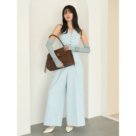 2タックのワイドシルエットがモードな雰囲気を漂わせるパンツ。ウエストはややハイウエストに設定し、脚をまっすぐ長く見せるバランスにこだわりました。フロントにはヴィンテージライクなゴールドの飾りボタンを2つ並べ、アクセントをプラス。後ろポケットにはLB刺繍を施し、細部まで「LILY BROWN」らしい遊び心を忍ばせています。同素材のジレ(品番LWFT261099)と合わせれば、より洗練されたセットアップスタイルが完成します。