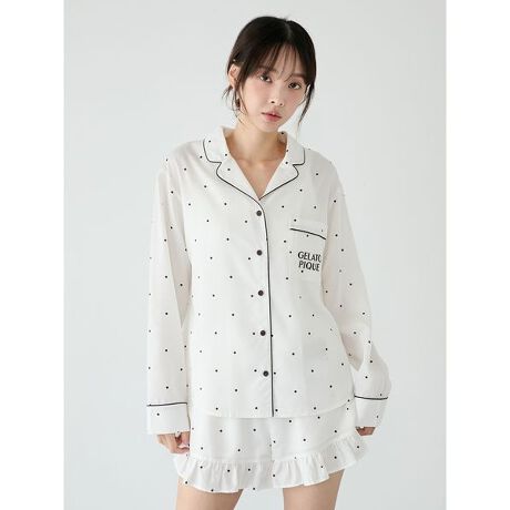 ホワイトデーや春の新生活にお届けしたい、まくらをモチーフにした癒しのルームウェアシリーズです。フリル付きのまくらの形をショートパンツに落とし込んだ、可愛いアイデアに心ときめく1枚。脇から裾までぐるりとあしらったフリルと、左腰にワンポイントで添えたロゴ刺繍がポイントです。色は3色で、オフホワイトはドット柄、ピンクは無地、ネイビーはギンガムチェック柄の生地を使用しました。同シリーズの3柄シャツや裏毛プルオーバーとコーディネートしてお楽しみください。