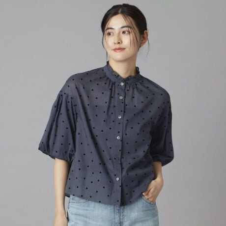 ふわりとエアリーな透け感のある袖が軽やかで、立体的なドットがスタイリングのアクセントになるブラウスです。