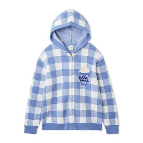 明るくHAPPYなカラーリングに、カップケーキやポップコーンのモチーフをデザインしたファミリーで楽しめるニットシリーズです。春らしいギンガムチェックを用いた、軽やかな着心地の’エアリーモコ’素材のジップパーカ。色は2色展開で、ピンクはカップケーキ、ブルーはポップコーンのモチーフをジャガードであしらいました。背面には大きな さがら刺繍入り。親子でおやつタイムを楽しんだり、ポップコーンを頬張りながら映画を観たり、そんなひとときにも似合います。同シリーズのショートパンツやカットソーアイテムを合わせるのもおすすめ。HOMME、KIDS、BABYとのリンク・コーディネートもお楽しみください。