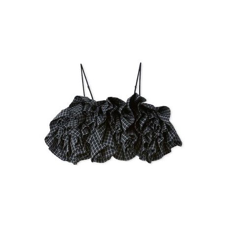 幅広のフリルをランダムに縫い付けた華やかなビスチェ。