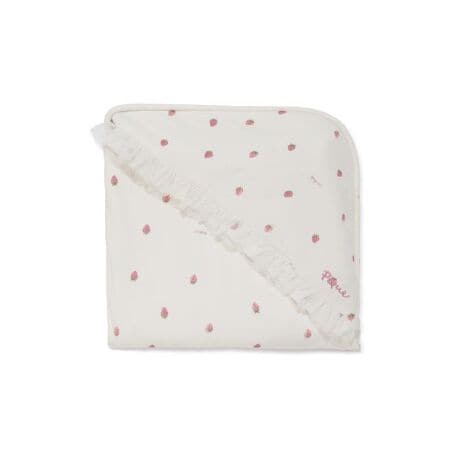 春が旬のストロベリー柄に、ふんわりとチュールを重ねたギフトにもおすすめのKIDS雑貨シリーズです。コットンの柔らかなカットソー素材を使用したブランケット。チュールをあしらったロゴ刺繍入りのフードが付いており、お昼寝からお出かけのシーンまで幅広く活躍します。記念日の写真撮影や動画撮影にも映えるアイテム。同シリーズのBABYアイテムと組み合わせて出産祝いのギフトにもおすすめ。KIDSアイテムヤママ雑貨とのリンク・コーディネートもお楽しみいただけます。