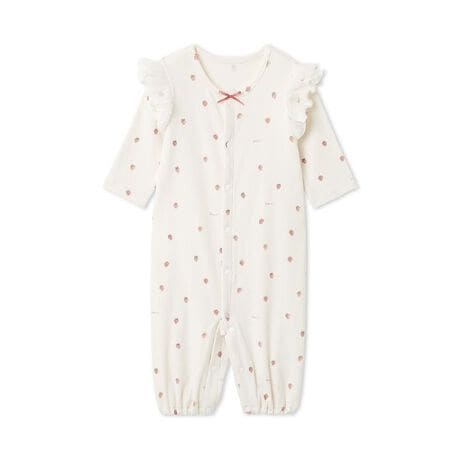 小さなストロベリー柄がキュートな、ギフトにもおすすめのBABYシリーズです。コットンの柔らかなカットソー素材を使用した2WAYオール。首元のストロベリー色のリボンと、フリルを効かせた袖口もポイントです。ボトムのボタンを付け替えるとロンパースとドレスオールの2WAY仕様になるので、赤ちゃんの成長に合わせて長く着用していただけます。記念日の写真撮影や動画撮影にも映える1枚。同シリーズの小物を合わせたり、KIDSアイテムやママ雑貨とのリンク・コーディネートもお楽しみいただけます。