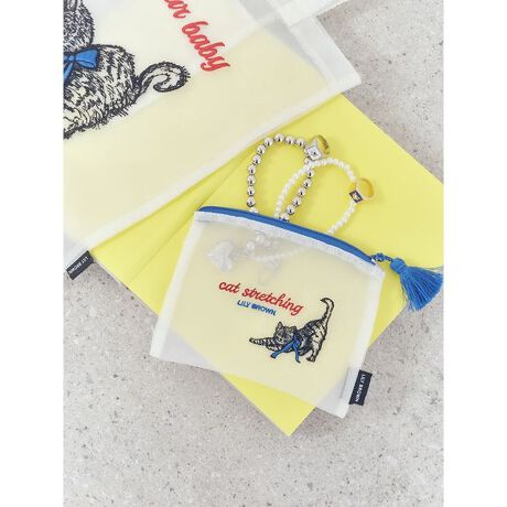 2月22日の“猫の日”に向けて登場したCATシリーズ。軽やかなシアー素材に、伸びをしている子猫をモノトーンの線刺繍で描いたキャッチーなアイテムです。「cat stretching」のカラーロゴを組み合わせ、アート感と遊び心が共存する奥行きのあるグラフィックに仕上げました。ファスナーテープの配色やフリンジチャームもアクセントとなり、持つだけで気分が上がるデザイン。ティッシュが入るちょうど良いサイズ感で、デイリーの小物収納に便利なアイテムです。