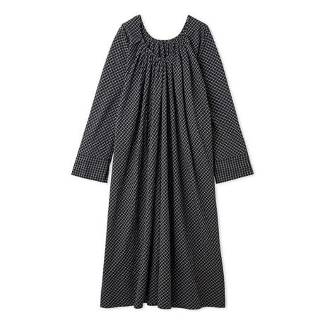 衿まわりにたっぷり入れたギャザーがポイントのフレアワンピース。