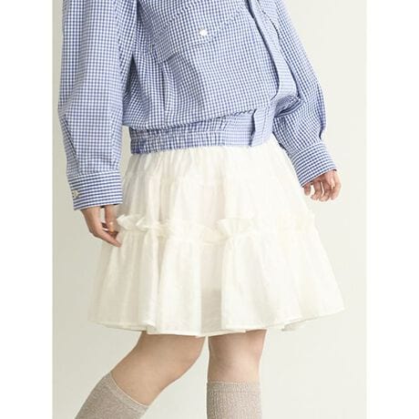 ハリのあるシアー素材を使用した、軽やかなティアードギャザースカート。ウエストはゴム仕様のためスカートとしてはもちろん、ベアトップスとしても着用可能な2WAYデザインです。両サイドにはリボンをあしらい、サイズの微調整ができると同時にスタイリングのアクセントにも。気分に合わせてシルエットや着こなしを変えられ、デイリーから特別な日まで幅広く活躍する1枚です。