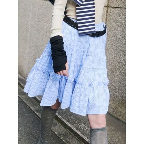 ハリのあるシアー素材を使用した、軽やかなティアードギャザースカート。ウエストはゴム仕様のためスカートとしてはもちろん、ベアトップスとしても着用可能な2WAYデザインです。両サイドにはリボンをあしらい、サイズの微調整ができると同時にスタイリングのアクセントにも。気分に合わせてシルエットや着こなしを変えられ、デイリーから特別な日まで幅広く活躍する1枚です。