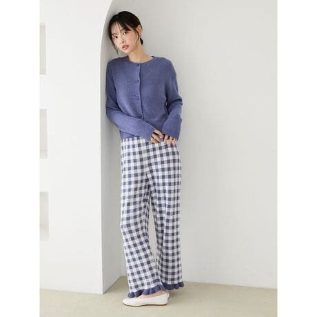 ホワイトデーや春の新生活にお届けしたい、季節感のあるギンガムチェック柄を取り入れたルームウェアシリーズです。’エアリーモコ’のふんわり感と、’スムーズィー’のなめらかさを両方味わえるニットを使用した、年齢を問わず着用いただける大人可愛いセットアップ。カーディガンはやや短め丈のコンパクトなシルエットで、単品でも大人っぽく着こなしていただける1枚です。ロングパンツは左腰にロゴのワンポイント、右後ろにポケットを付け、裾にフリルをあしらいました。色は落ち着いたネイビーと柔らかなブルー、ピンクの3色展開。ホワイトデーの贈り物にはもちろん、春の新生活に向けたギフトにもおすすめです。