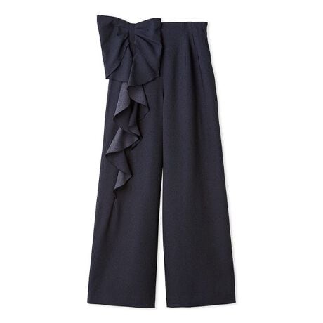 リボンを模したフリルデザインをダーツに挟み込んだ華やかなワイドパンツ。リボン部分は所々立体に仕上がるように止めているので風合いをキープすることができます。