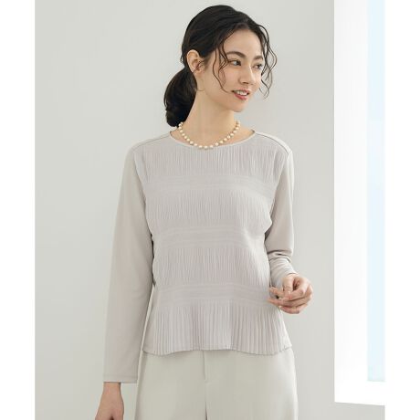 上品さも兼ね備えた着心地のよいデザインブラウス■デザインマジョリカプリーツによる繊細なシャーリングライクの表情が印象的な、シフォンコンビジャージトップスです。後身頃と袖にはジャージ素材を使用しているため、ストレッチ性があり快適な着心地です。前身頃はブラウスライクなディテールで仕上げており、ジャケットインにも最適な上品さを兼ね備えています。ブラウス見えしながらもリラックスして着用できる、コンフォータブルなジャージアイテムです。■素材ボディ生地は、上質でマットな質感が特徴のストレッチポンチです。絶妙な撚糸によるマットな質感と、滑らかタッチは今までにない合繊の風合い、糸が持つストレッチ性によるプルンとしたハリ感も特注の素材になります。フロントは、薄手のジョーゼット生地に細かいヒダをつふんわりしたプリーツを掛けています。薄手のカットソー生地を前見頃の裏に裏打ちしています。