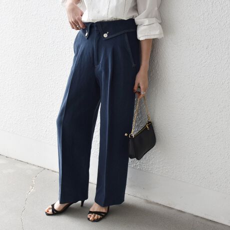 ウエストの折り返しデザインが目を引く、セミワイドパンツ。