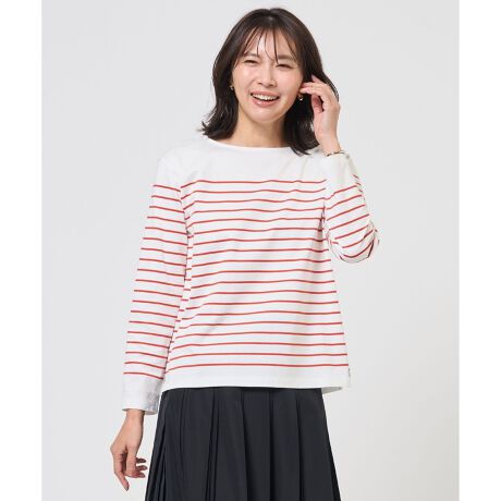 ■デザインオリジナルのボーダーピッチとワッペンがポイントのバスクボーダーカットソー。大きすぎない程よいシルエットは、様々なボトムスに合わせやすく、洗練されたカジュアルスタイルを叶えます。ジャケットやカーディガンのインナーとしても重宝し、季節の変わり目にも活躍してくれます。着るだけで春の気分が上がる、大人カジュアルスタイルに欠かせない1着です。カラーは、華やかで女性らしい印象のスカーレットボーダー(#111)、爽やかで上品な抜け感を演出するアクア&ベージュボーダー(#172)、定番のきちんと感を醸し出すネイビーボーダー(#175)の3色展開です。