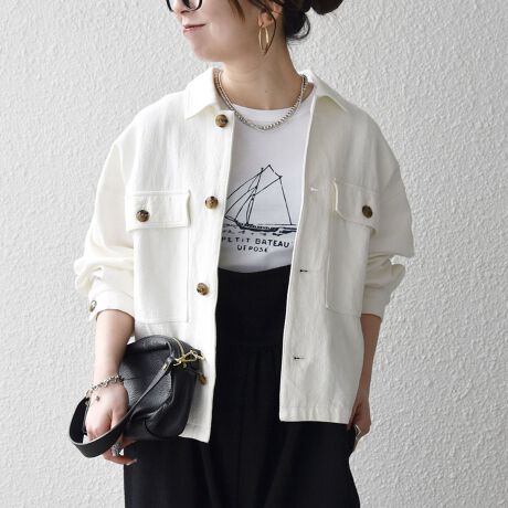 胸元のフラップポケットや大きめのボタンなどワーク要素もありながら、女性らしく着用いただけます。