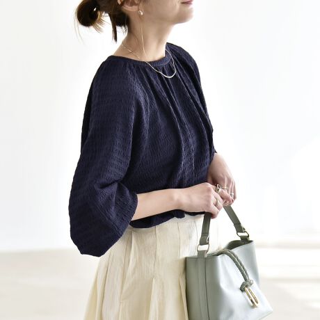 ネックラインや裾に寄せたギャザーが柔らかな丸みを生み、女性らしいシルエットに。