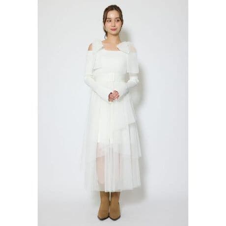 【シアー感の美しいチュールをランダムに重ねたスペシャルなニットドッキングワンピ】■ポイントシアー感の美しいエレガントなソフトチュールを使用してドラマティックに仕上げた、気分を盛り上げるスペシャルなニットワンピース。■ディテールトップ部分は2×2リブで美シルエットへと導きます。スカート部分はランダムヘムのティアードデザインで軽やかに、躍動感を出しました。■スタイリング1枚で華やかに完成する、チュールニットワンピ。ショルダーのチュールは取り外し可能。ベルトもスタイリングにあわせて、有り無しができるのも嬉しいポイントです。足元は2月ならショートブーツか、ロングブーツがお勧め。■生地透け感:チュール/あり、ニット/無し裏 地:あり伸縮性:チュール/無し、ニット/あり光沢感:なし厚 さ:チュール/薄手、ニット/中肉■商品のお気に入り登録お気に入りアイテムの再入荷・在庫1点などの通知を受け取ることができます。[注意事項]※画像の商品はサンプルです。実際の商品と仕様、加工が若干異なる場合があります。※画像の商品は光の照射や角度、お使いのモニター環境により、実物と色味が異なる場合がございます。※着用、お取り扱いの際は、アテンションタグをご確認ください。