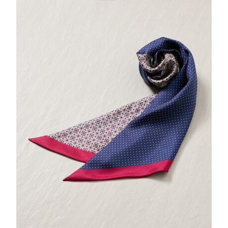 2つの柄のコントラストがスタイリングにさりげないアクセントを添え、巻き方次第で印象の変化を楽しめます。細身ながらも存在感があり、ブレザーやジャケットスタイルの胸元・首元に好相性です。