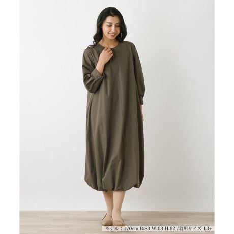 一枚で清楚な装いが完成する、ノーカラーの七分袖ワンピース。急な天候の変化にも対応しやすい加工が施されており、お出かけの際も安心です。ご自宅でのお手入れも簡単なため、これからの季節に気兼ねなくお召しいただけます。お客様の声から生まれた「プラス企画」ならではの、美しさと実用性を兼ね備えた、頼れる一着です。