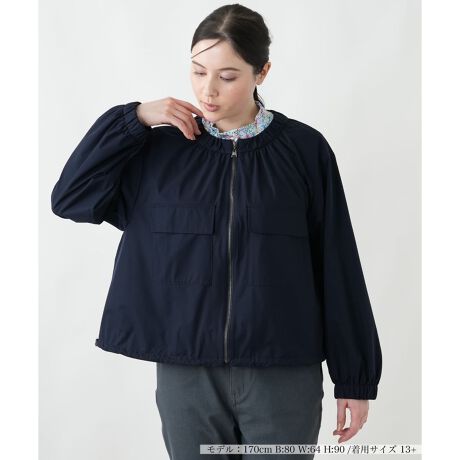 顔周りをすっきりと見せるノーカラーの丸首ジャケット。急な小雨などを弾きやすい加工が施されているため、天候が不安定な季節の変わり目に重宝します。ご自宅でのお手入れも簡単なため、デイリーにさっと羽織れるのが魅力。同素材のワンピースと合わせれば、統一感のある上品なアンサンブルスタイルをお楽しみいただけます。
