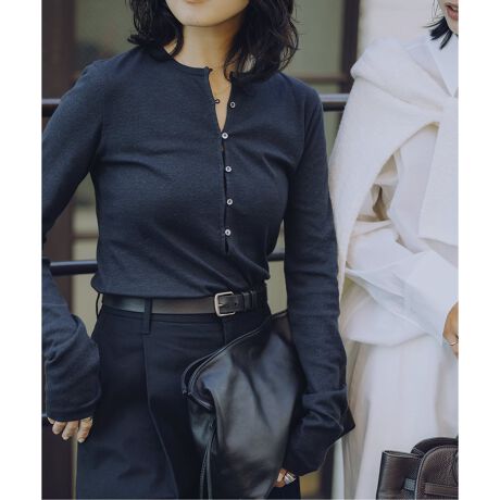 あえて深めにしたヘンリーネックには小さいながらも厚みのあるボタンを採用することで重厚感のある仕上がりに。
