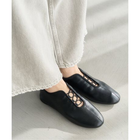 フロントのレースアップコードはゴムになっており、ワンタッチで着脱可能なソフトなフラットシューズ。
